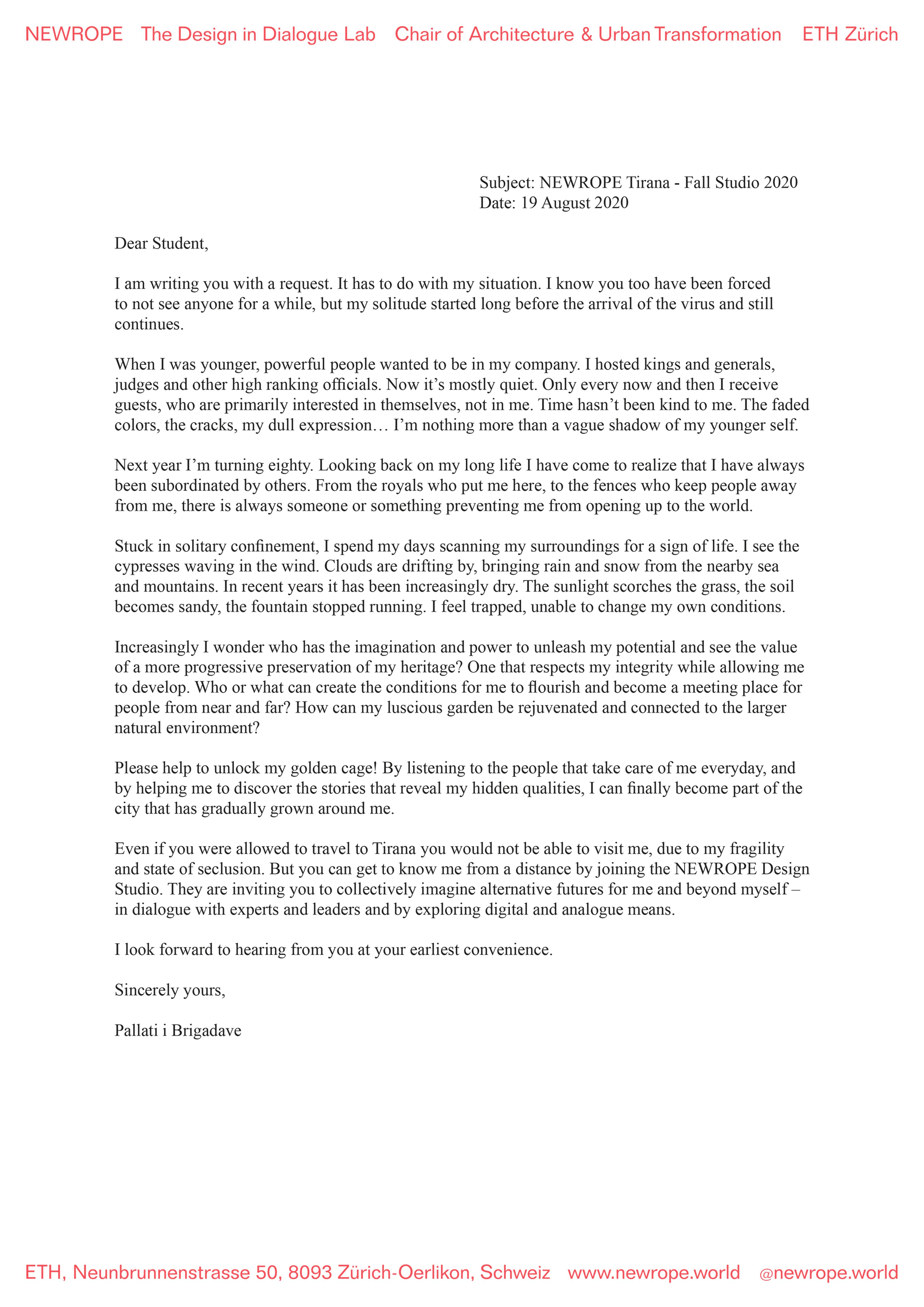 As an invitation for the fall 2020 design in dialogue studio students received the following letter from the Palace of Brigades in Tirana. The studio started in September and last until mid December. Click here to find more information about the studio and the students projects.