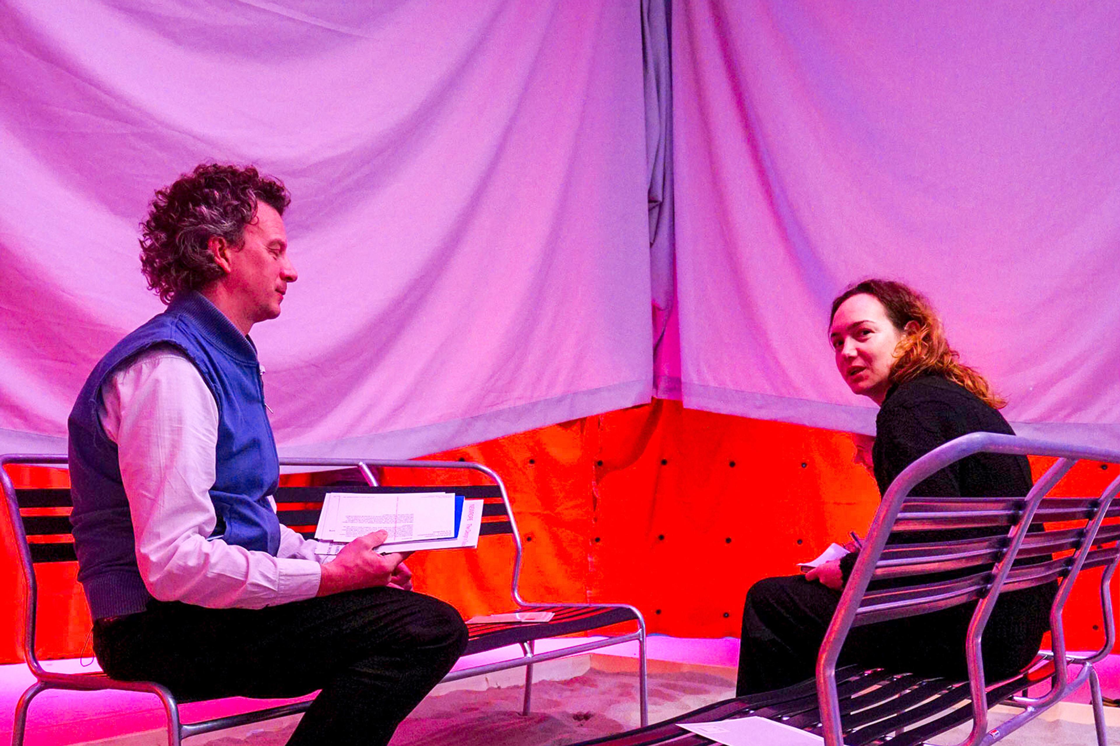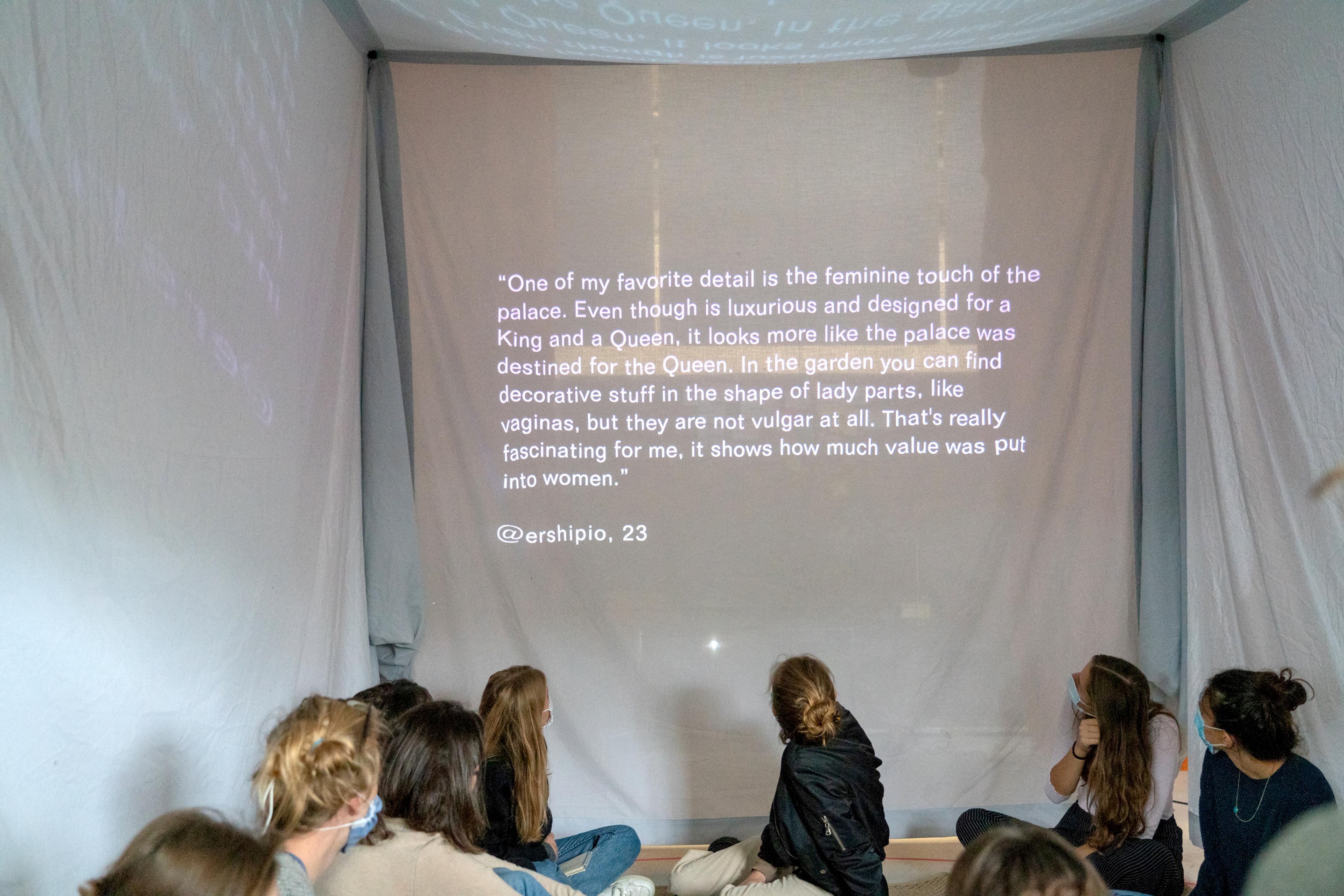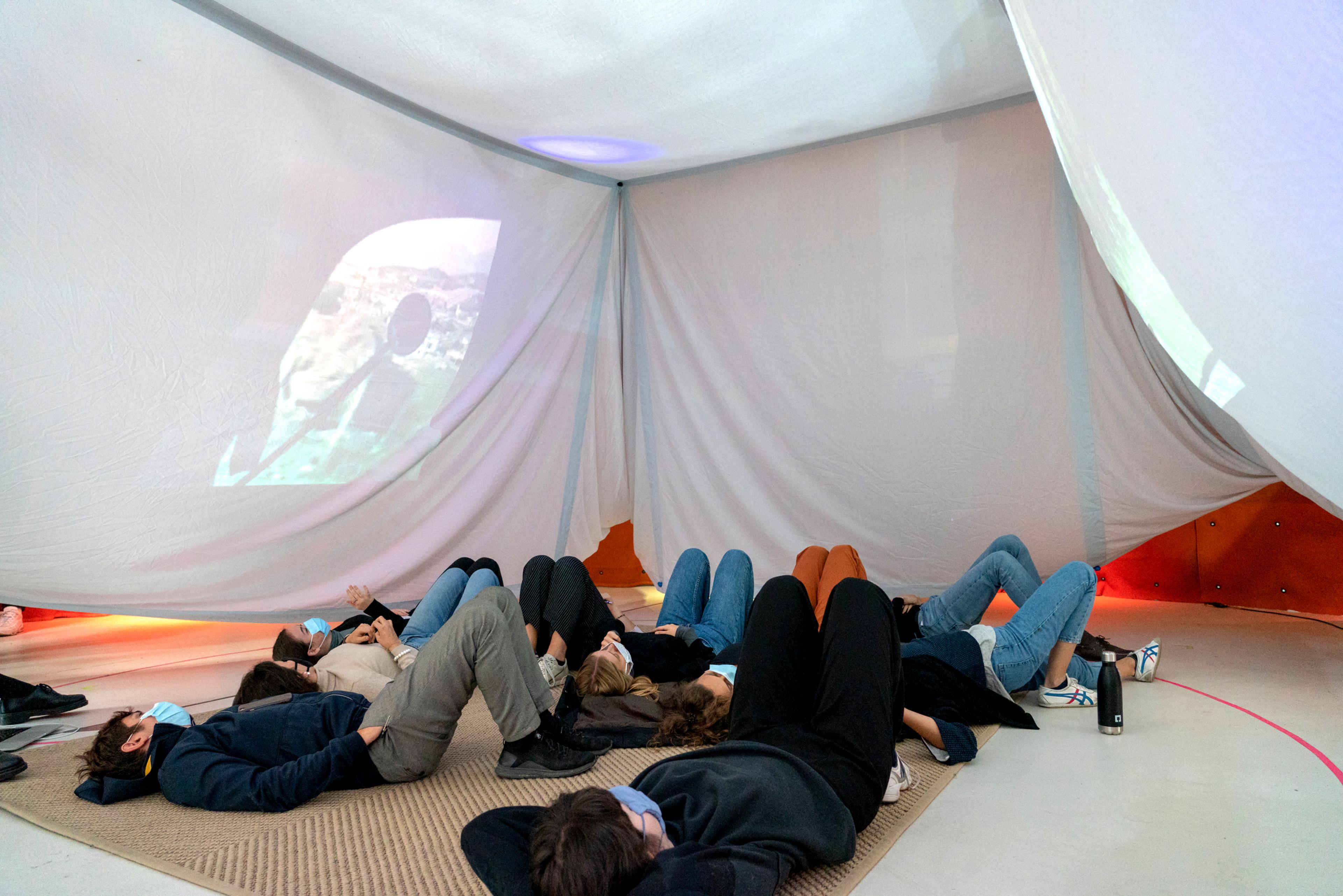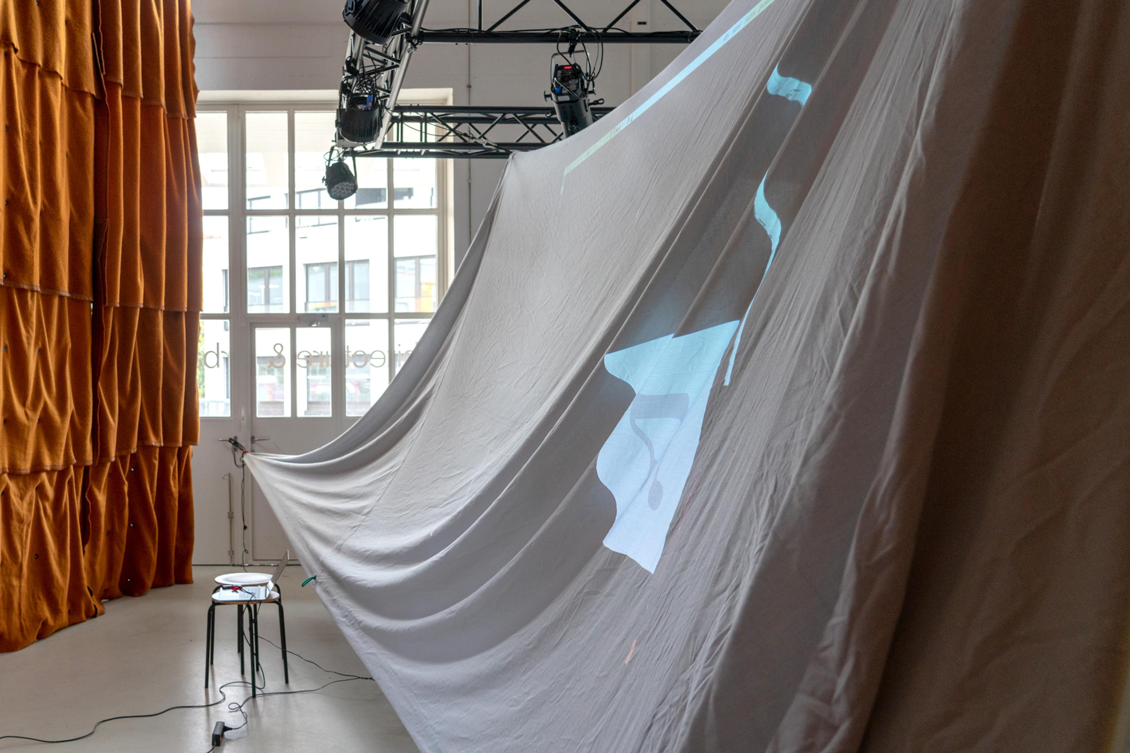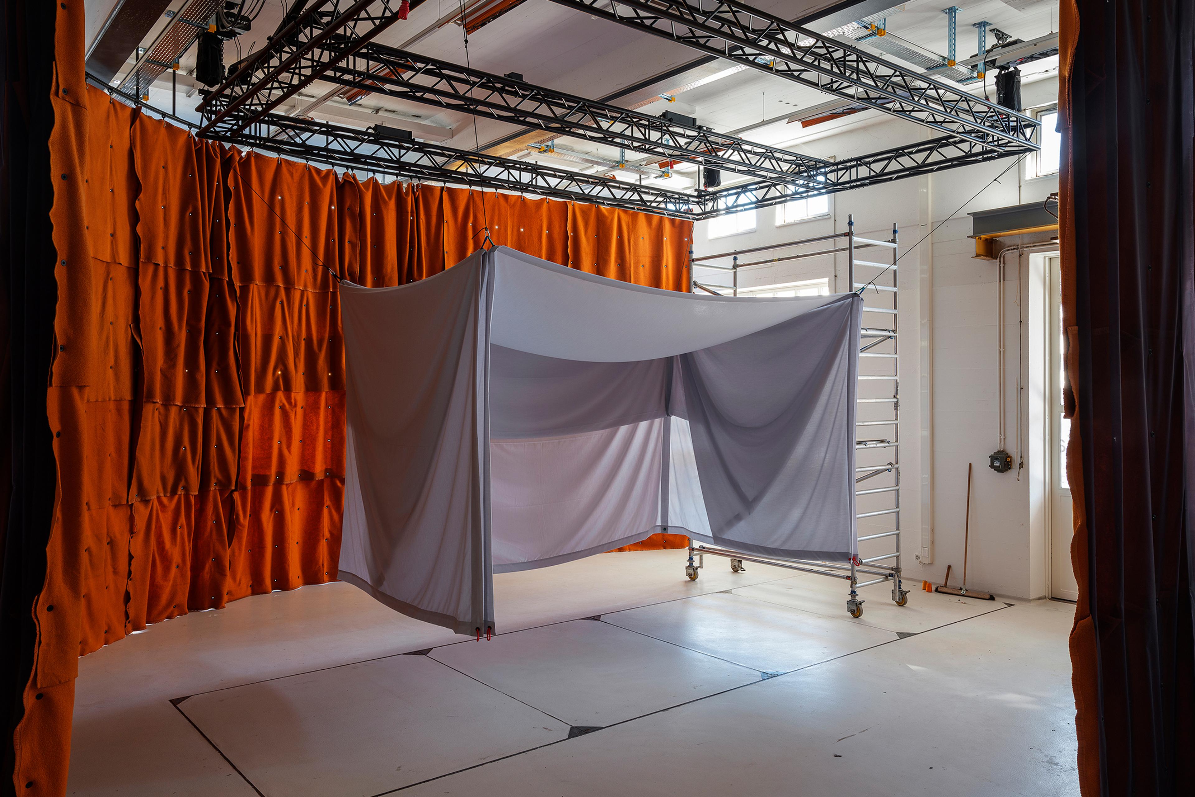 Designed by Brussels based textile design studio chevalier masson, the Cabane is an element to bring people together and to create an intimate and safe atmosphere for exchange, a space inside a space, to project on and present and discuss.