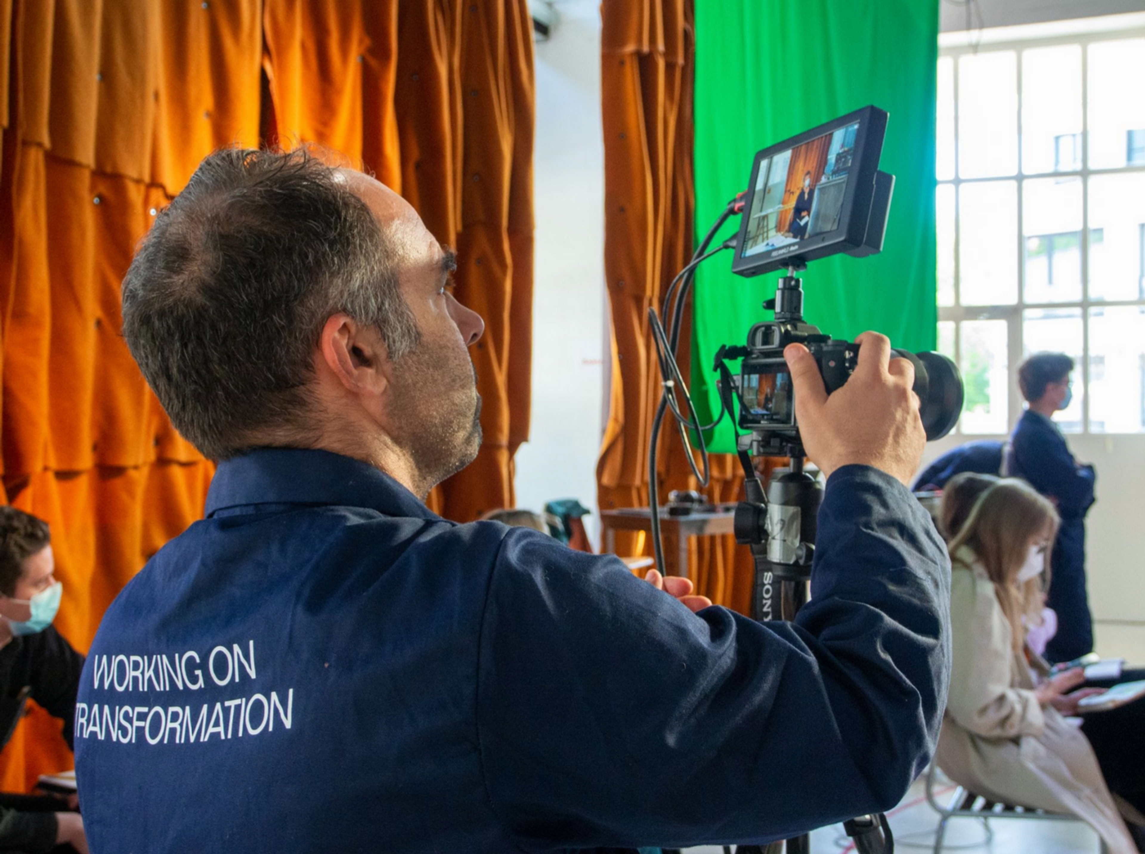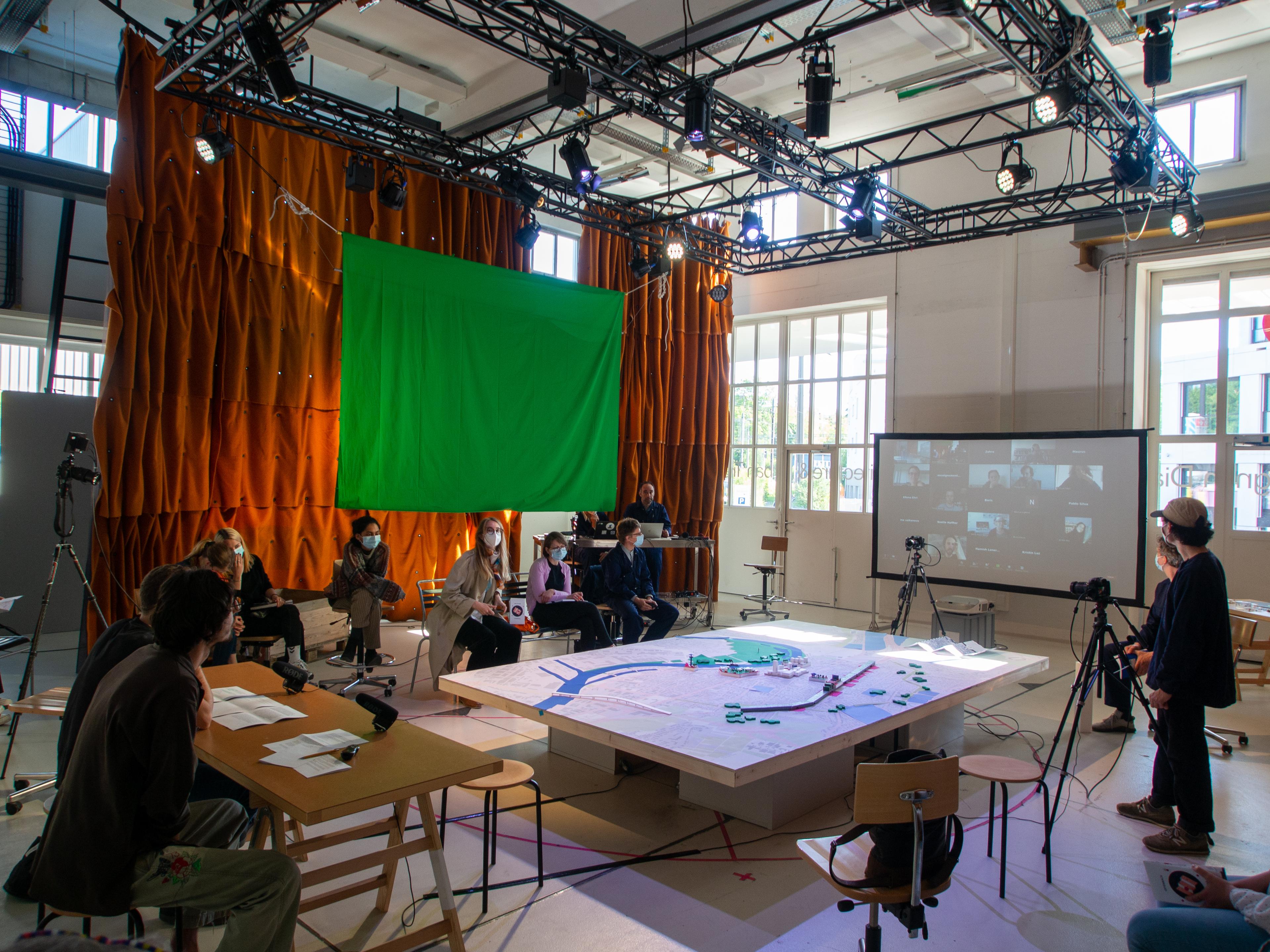 Trying to organize the final presentation of the Offenbach design studio, with all guests from the Offenbach city participating online, and all students presenting their work physically from our Design in Dialogue lab in Zurich, would require a very complex TV studio setup with multiple technicians, which would be both expensive and intimidating. Instead, we experimented successfully with spreading light and easy to use equipment around the space, engaging the students themselves to document the moment and turn the cameras in the right direction, switch between cameras, use the microphones where needed, and more. A very empowering and playful experience, through which we learned a lot.