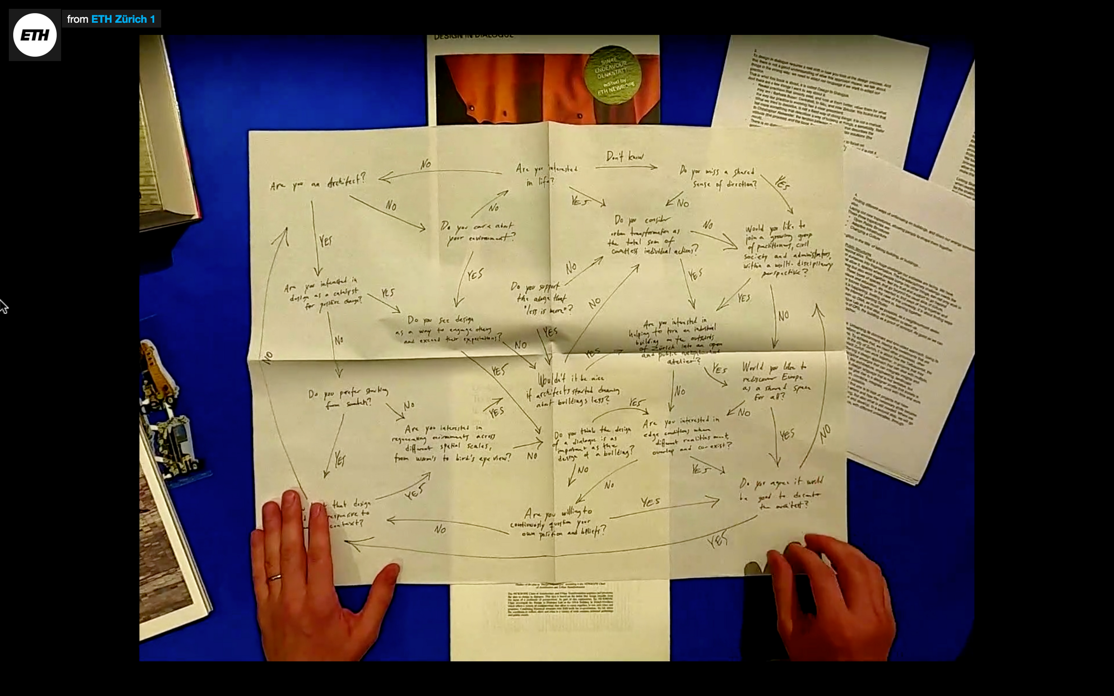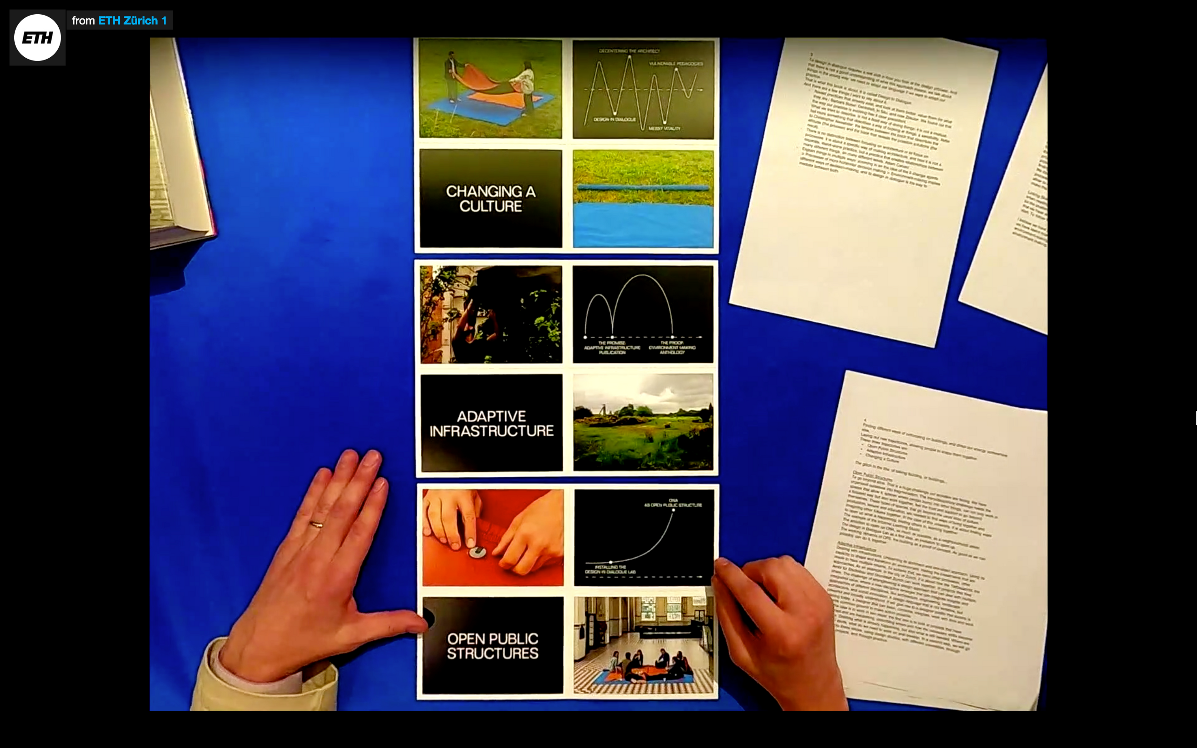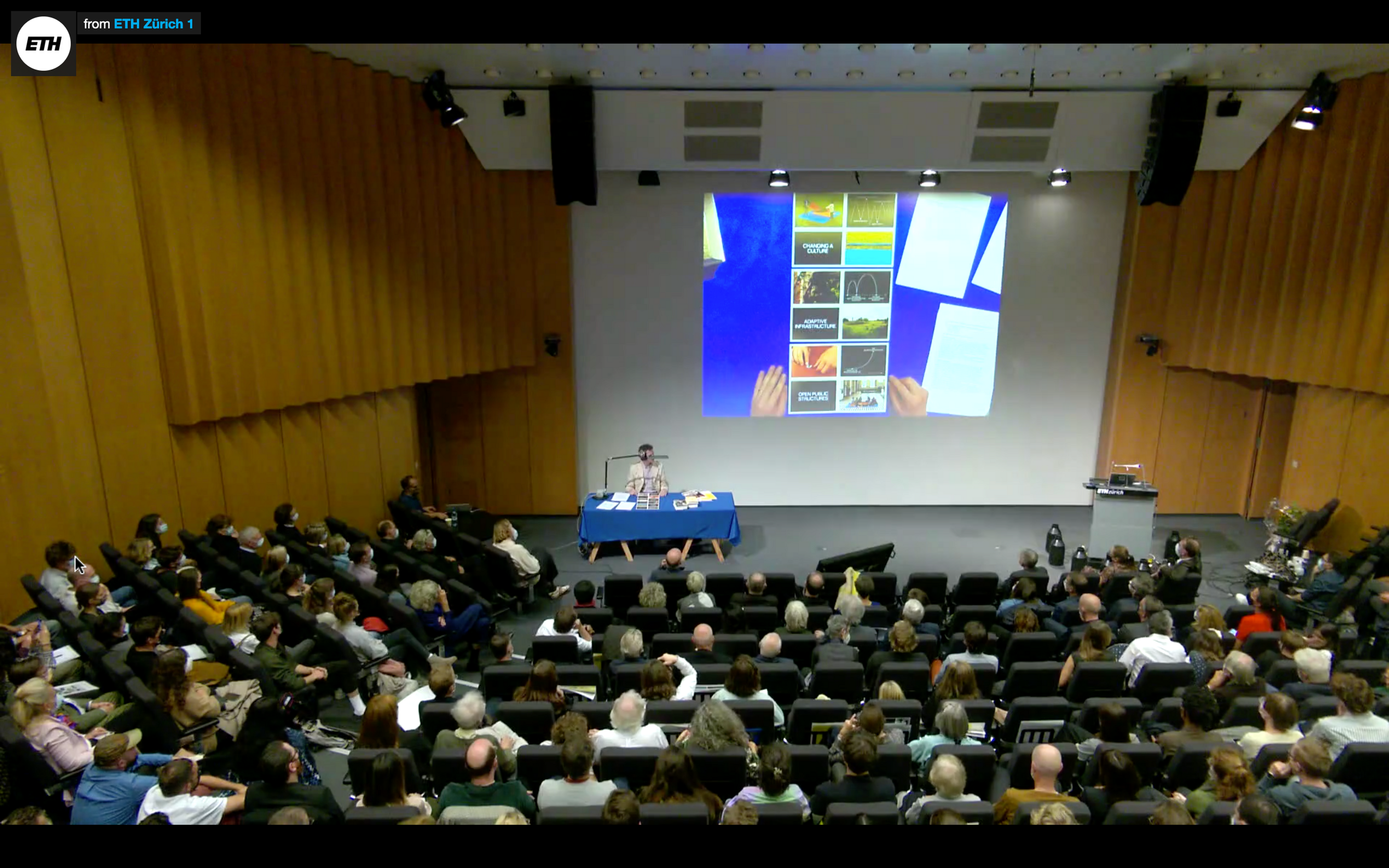 For his inaugural lecture at ETH Zurich, Prof. Freek Persyn did his presentation through a performative lecture, where a live and online audience could watch him browsing through books, cards, and magazines representing his work. The typical visualizers that are used in the university’s classroom wouldn’t allow for the type of free movement that this performance required and are also not aesthetically pleasing. It was not only the actual “content” that was shown that was of importance but also the image of the whole performance itself.
