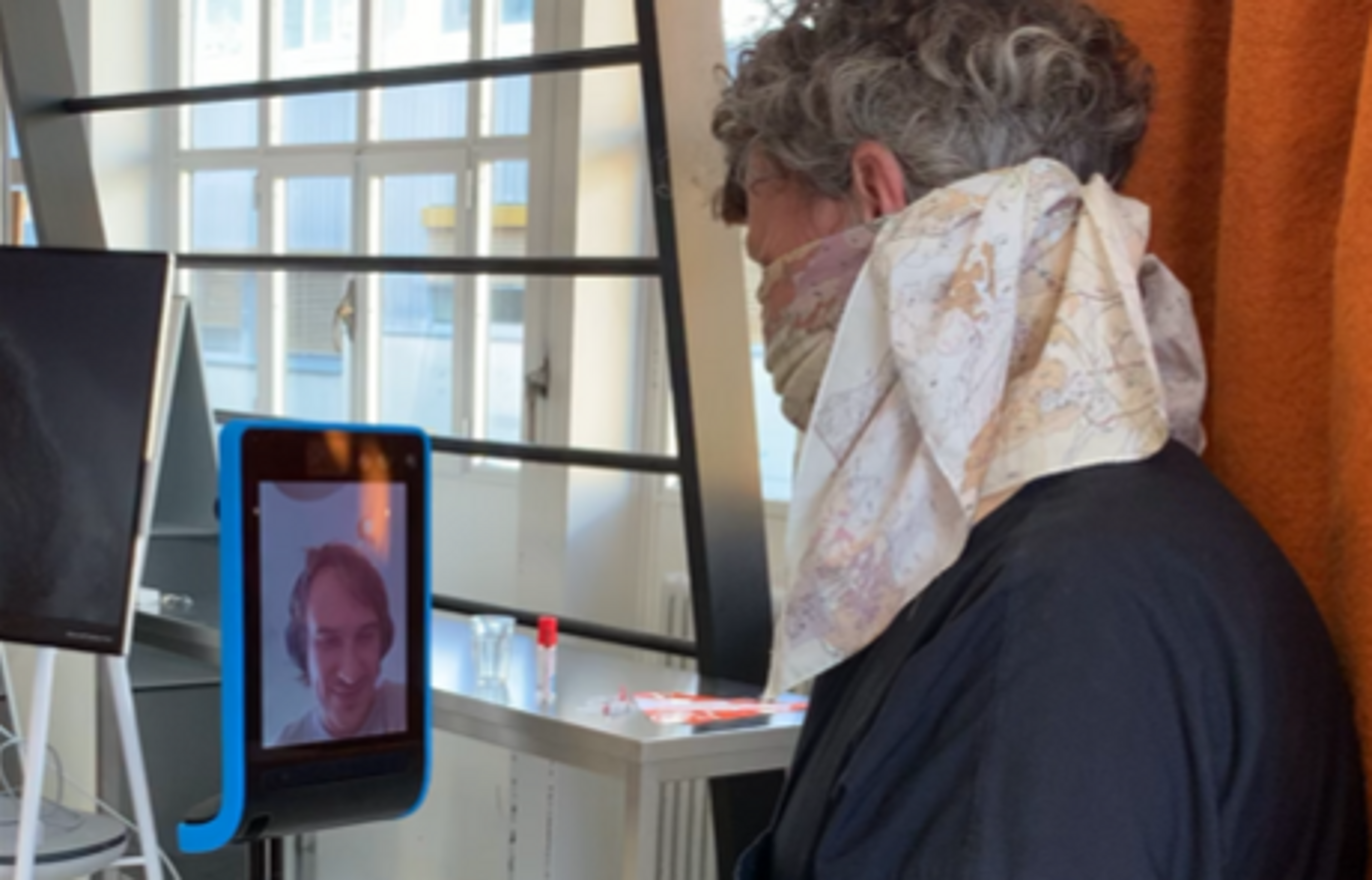1) a telepresence robot allowed our guests to roam around the Design in Dialogue Lab independently and informally and address individual students or only a part of the group, with the drawback that there are still technical issues with such devices, and they might attract too much attention;