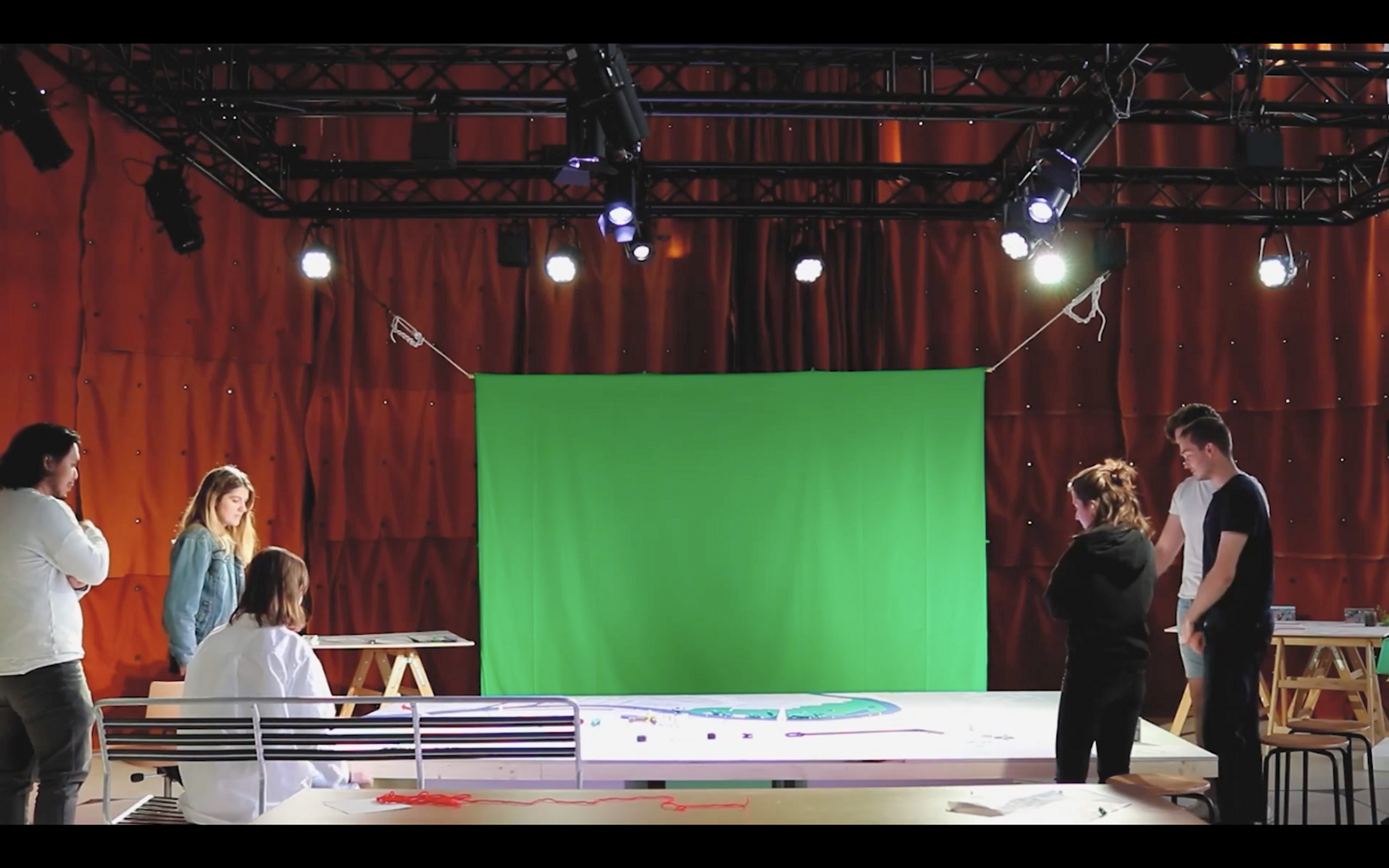 2) a green screen to create links to remote places with the drawback that those physically in the space cannot see the hybrid online representation.