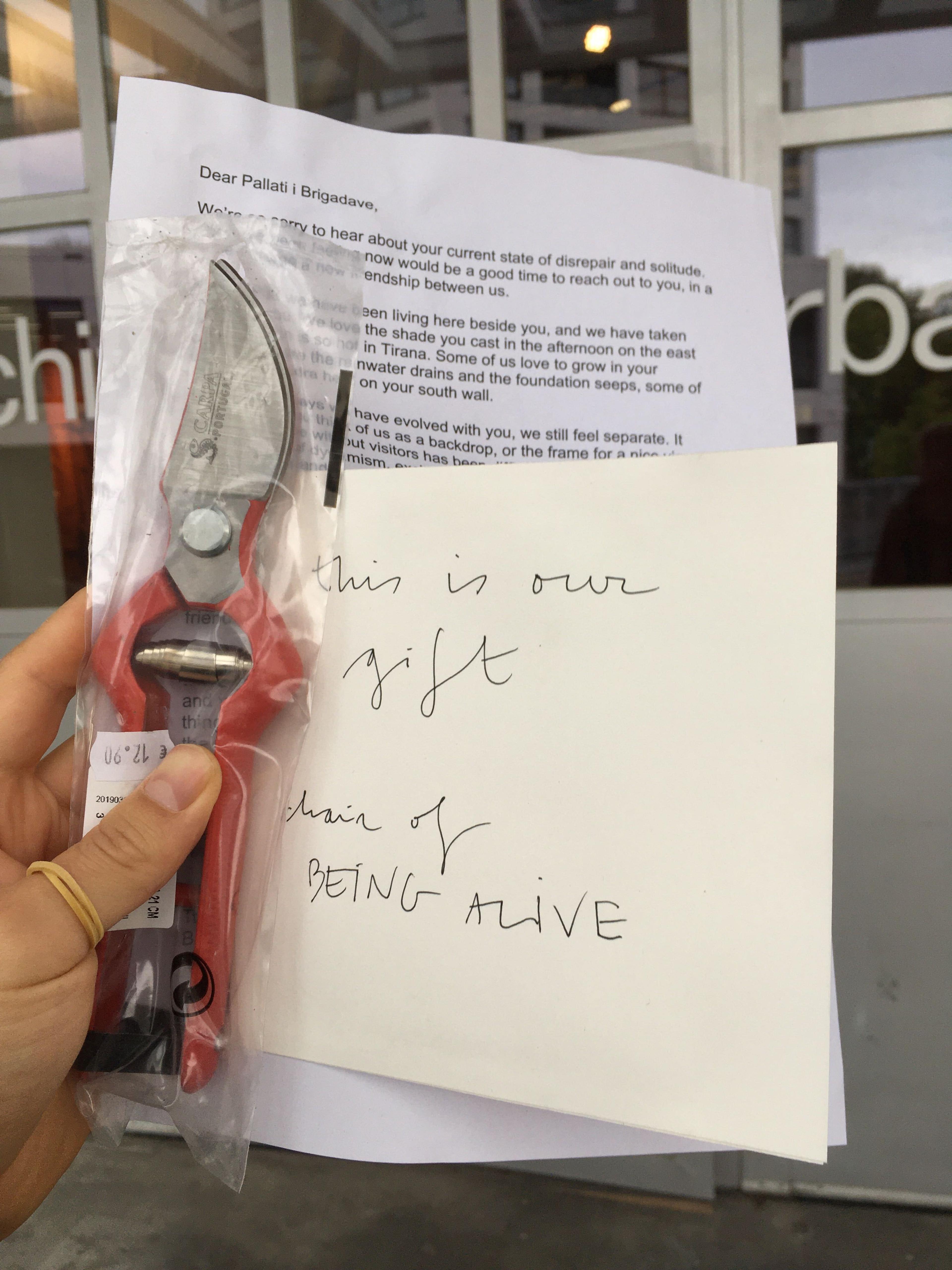 Update: Following their thoughtful letter, the BEING ALIVE team send us this gift. Meant to selectively remove branches from a plant and encourage healthy growth, we see this gift as an invitation to think carefully about the role of critical care and creative destruction when working on ideas for the reactivation of the palace and its gardens.