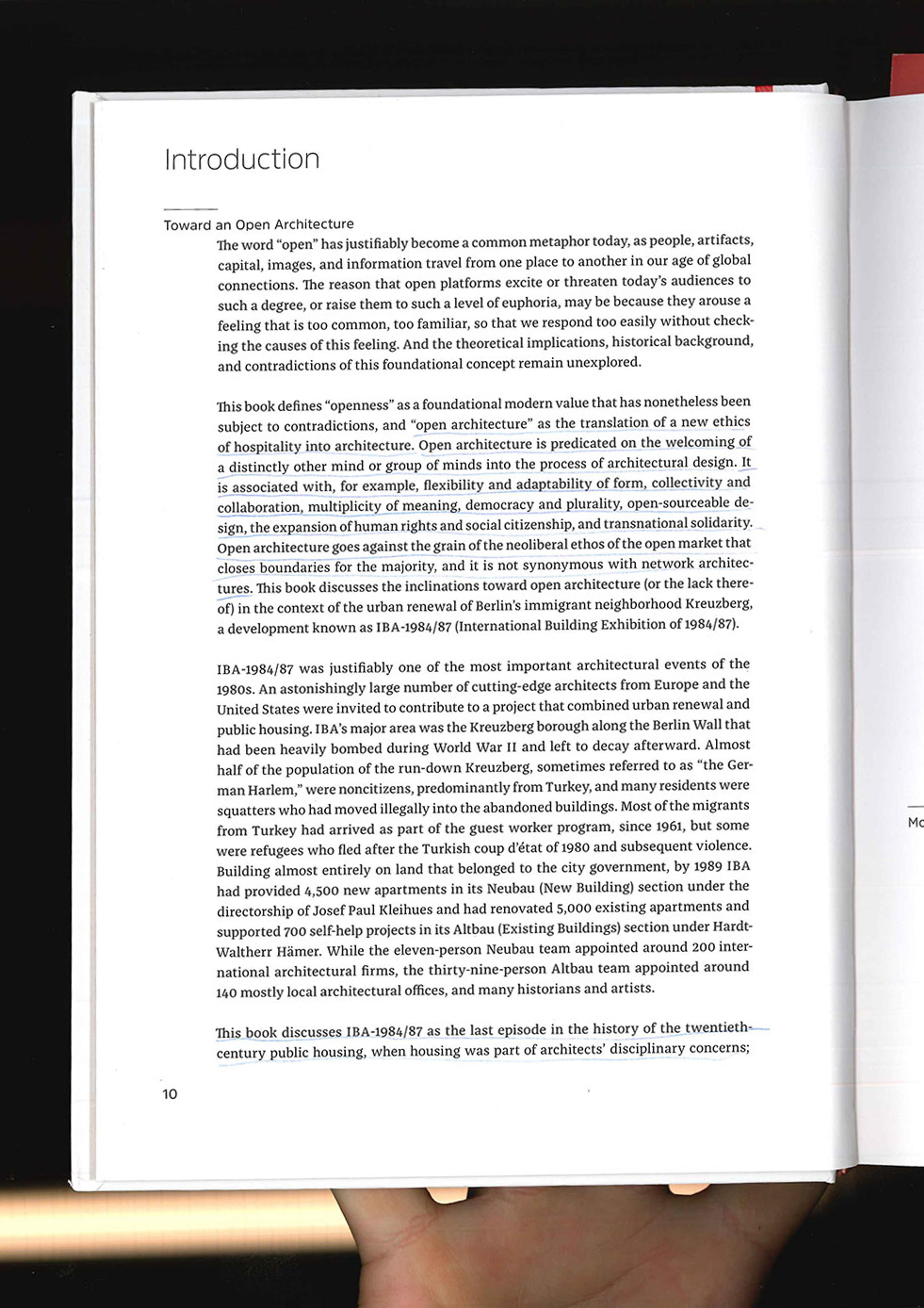 “The book asks what would have happened if the architectural discipline and profession were shaped by a new ethics of hospitality toward the immigrant, and calls this open architecture. It [...] conceptualizes open architecture's various types with terms such as flexibility and adaptability of form, unfinished and unfinalizable design, collectivity and collaboration, participation and democracy, and multiplicity of meaning.” (From the preface)