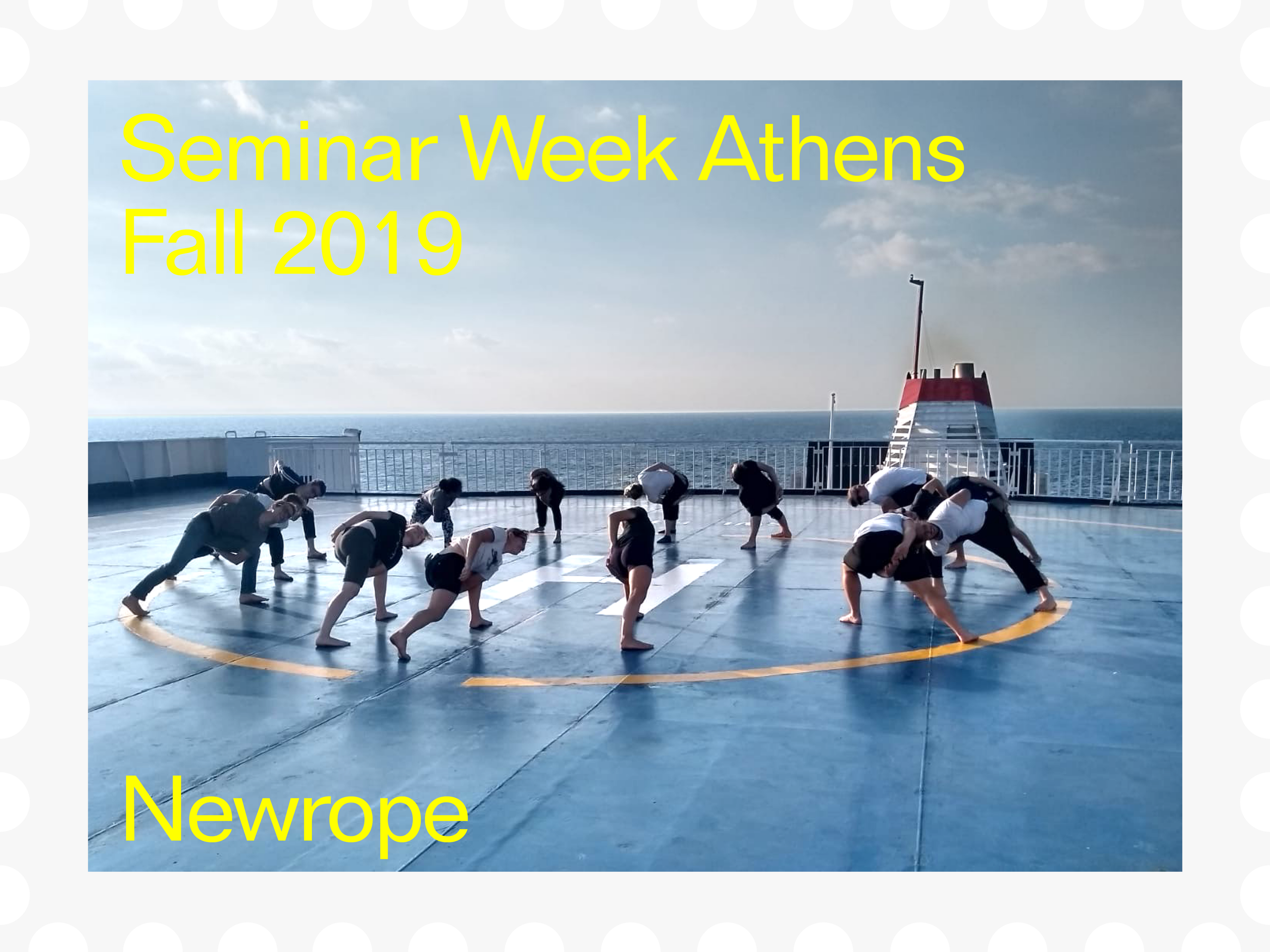 The format of documentation of the seminar week were individual mobile phone video diaries of 1 minutes per day to reflect on Newrope in Athens. Each student produced 5 videos of 60 seconds each during the course of the week. For the final performance we collectively produced a 15 minute. Each one of them showed the one for him or her most meaningful minute. For this, they chose the setting within Communitism themselves and one after the other handed over a portable projector. By choosing different rooms, sizes and positions, the screening became a very divers spatial experience including the whole building.
