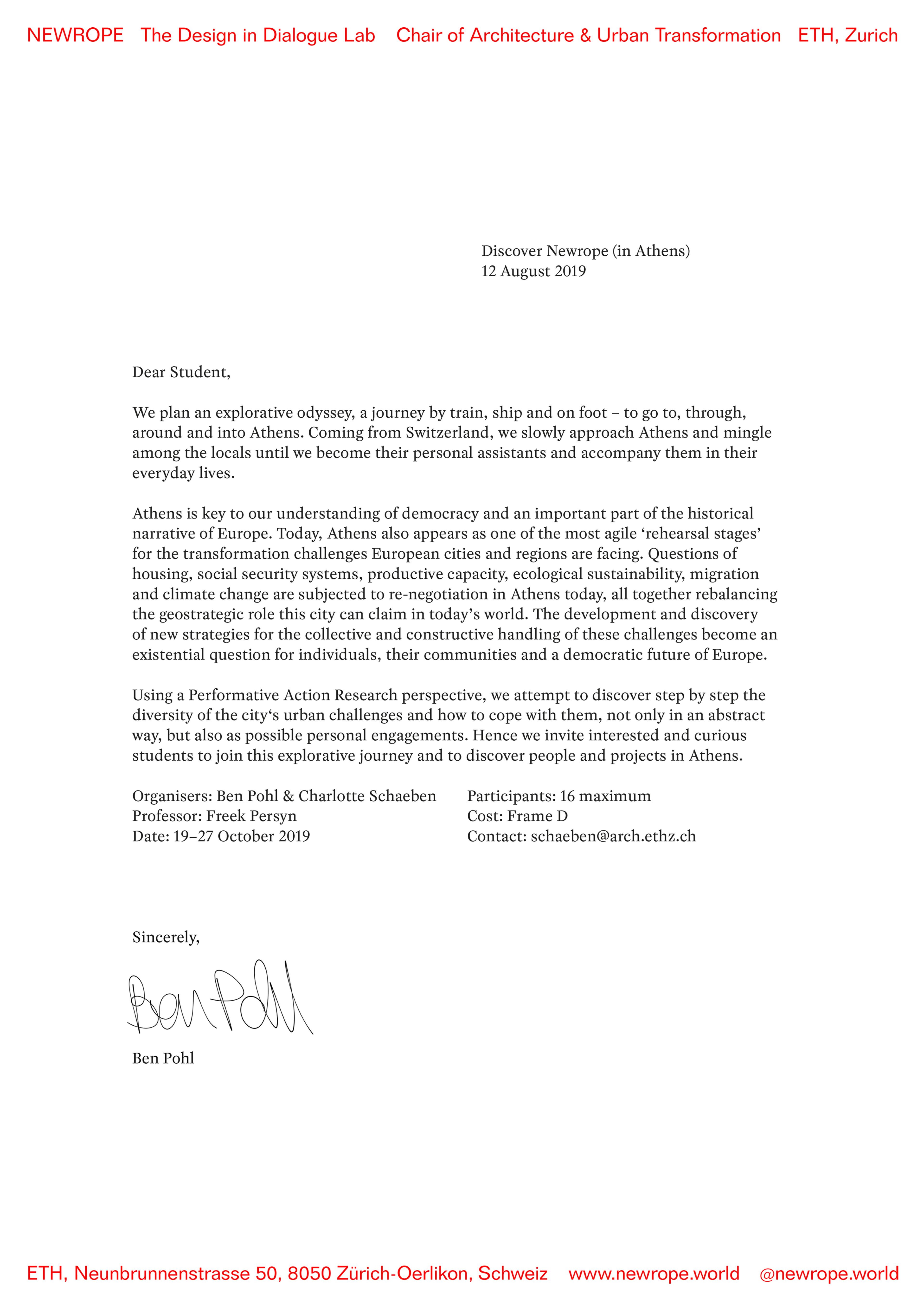 In October 2019, we invited students to join us on an explorative odyssey, a journey by train, ship and on foot – to go to, through, around and into Athens. Coming from Switzerland, we slowly approached Athens and mingled among the locals until we became their personal assistants accompanying them in their everyday lives.