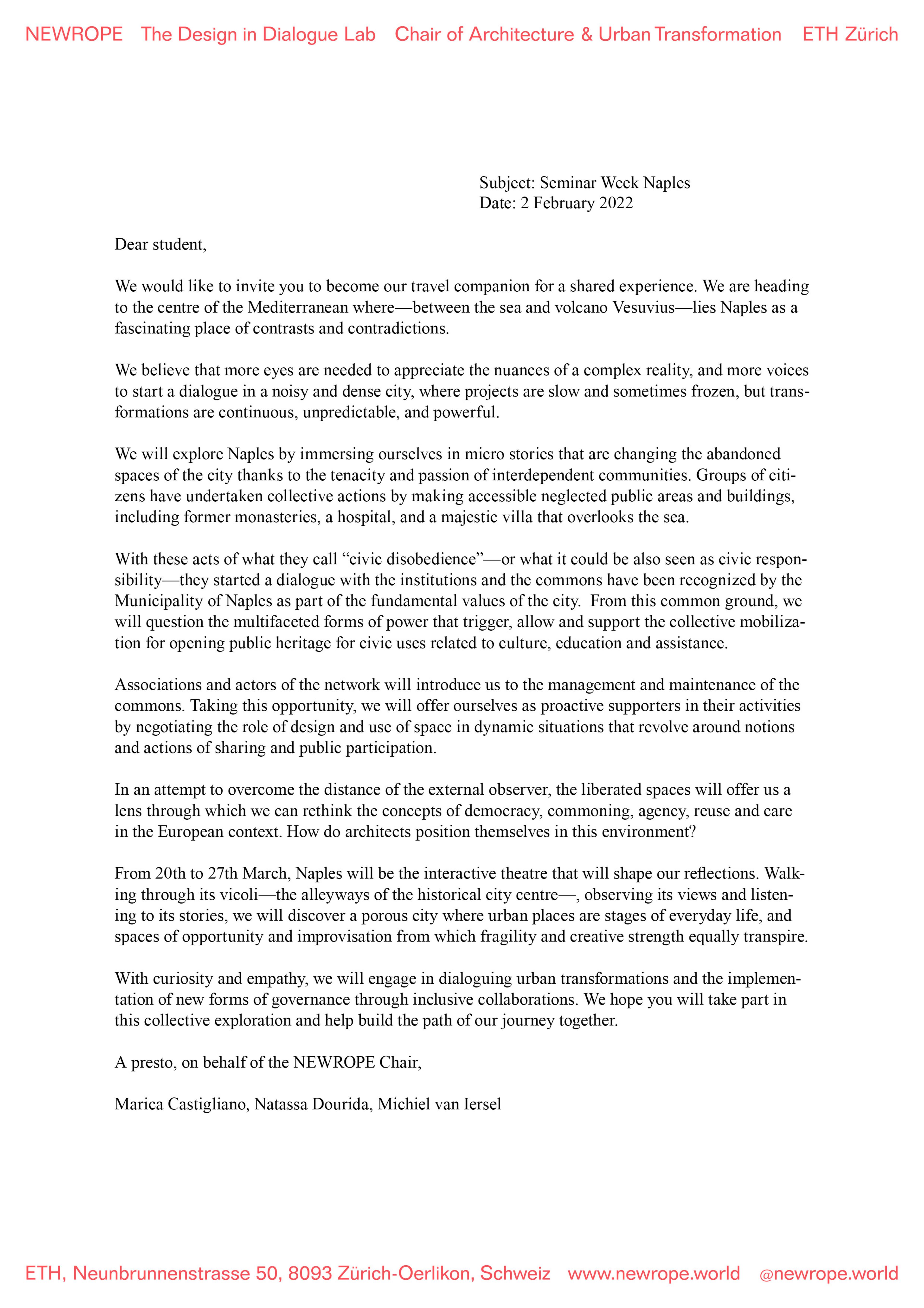 From 20th to 27th March, Naples will be the interactive theatre that will shape our reflections. Walking through its vicoli—the alleyways of the historical city centre—, observing its views and listening to its stories, we will discover a porous city where urban places are stages of everyday life, and spaces of opportunity and improvisation from which fragility and creative strength equally transpire.