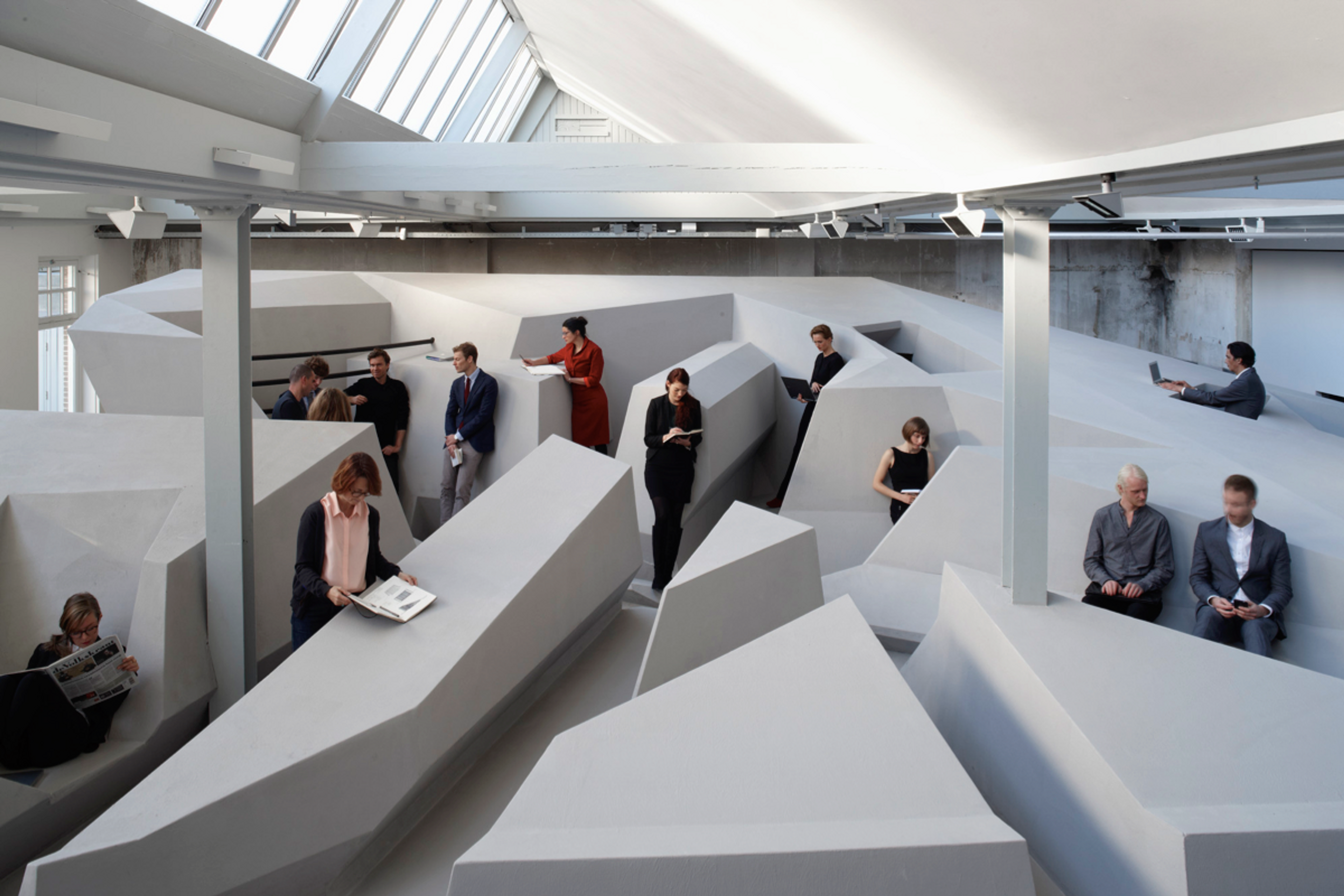 While approaching or entering the ONA building, you are confronted with a series of both physical and intangible obstacles and borders. Despite efforts to make it more accessible, the building's introverted nature continues to echo in its appearance. The grey concrete walls communicate the story of a space constructed to keep noise inside and people outside. Surrounded by railway tracks and other infrastructure, the main entrance is hidden behind a busy loading bay where trucks pull up during the day to load or unload goods. Once inside, the vast open ground floor is subdivided by walls in an attempt to create a sense of intimacy.